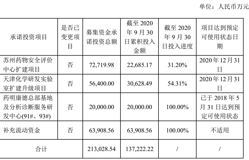 按照原计划,药明康德拟将IPO募资中的7.27亿元用于苏州项目、5.64亿元用于投资天津项目,两个项目在2020年12月31日达到可使用状态。但根据该公司披露信息,目前苏州项目与天津项目截至2020年9月30日的投入进度分别只有31.2%、54.31%,显然比较滞后。