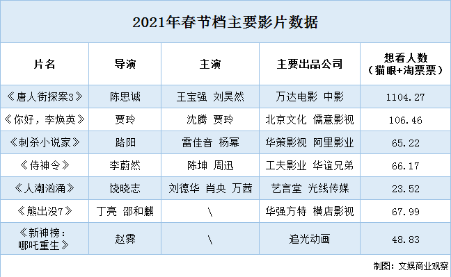 资料显示《唐人街探案3》背后的主出品公司是万达电影;《侍神令》背后的主出品公司是华谊兄弟;而《你好,李焕英》是北京文化、《人潮汹涌》是光线传媒、《刺杀小说家》是华策影视。