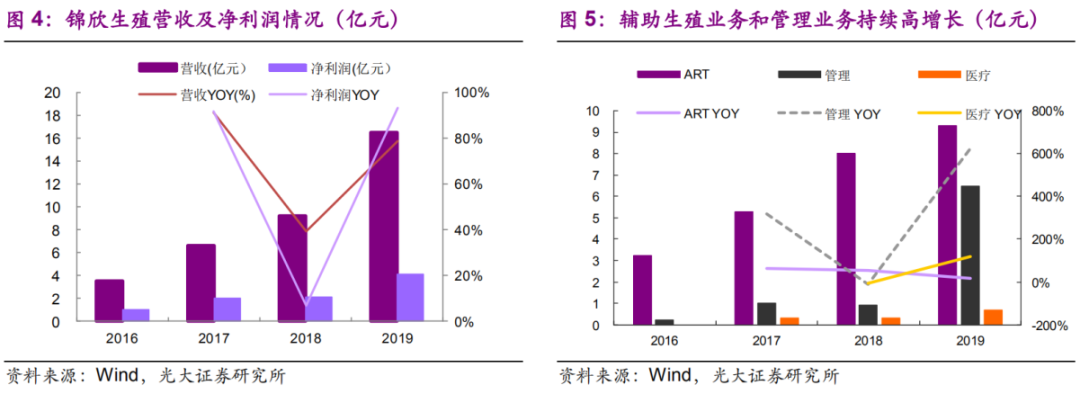 目前,锦欣生殖的辅助生殖服务主要由成都西囡医院、深圳中山医院提供,管理服务主要是通过协议向锦江生殖中心和位于美国加利福尼亚州的HRC Medical中心提供合作以收取管理费来展开,而辅助医疗服务主要是在各科室提供医疗服务,目前体量还比较小。