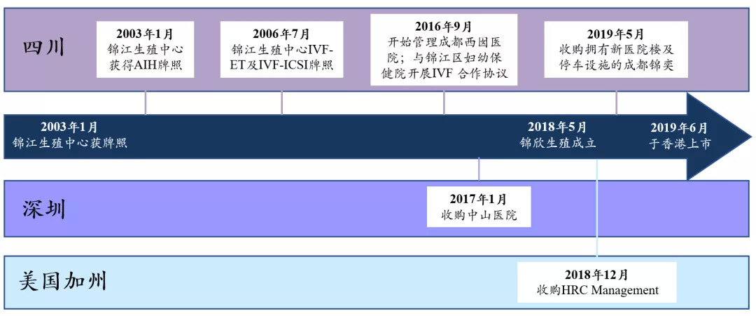 锦欣生殖发家的锦江生殖中心,于2003年1月获四川省卫生厅批准获得AIH牌照,能提供夫精人工授精的治疗,之后又在2006年7月获得IVF-ET(体外受精-胚胎移植)、IVF-ICSI(卵胞浆内单精子显微注射)等牌照。2010年往四川拓展,成立了成都西囡妇科医院。