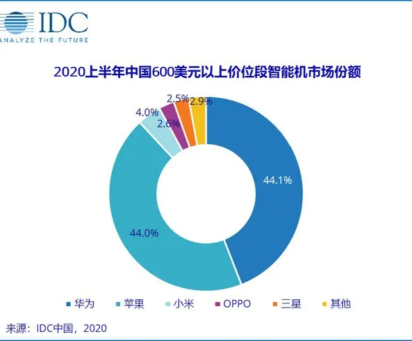虽然2020年第三季度,华为在国内600美元以上价位段依旧占据着接近45%以上的份额。