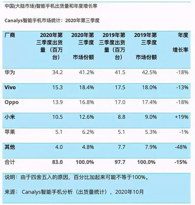 2020年第三季度,vivo在国内的市场份额为15.3%,同样位列华为之后的第二名。