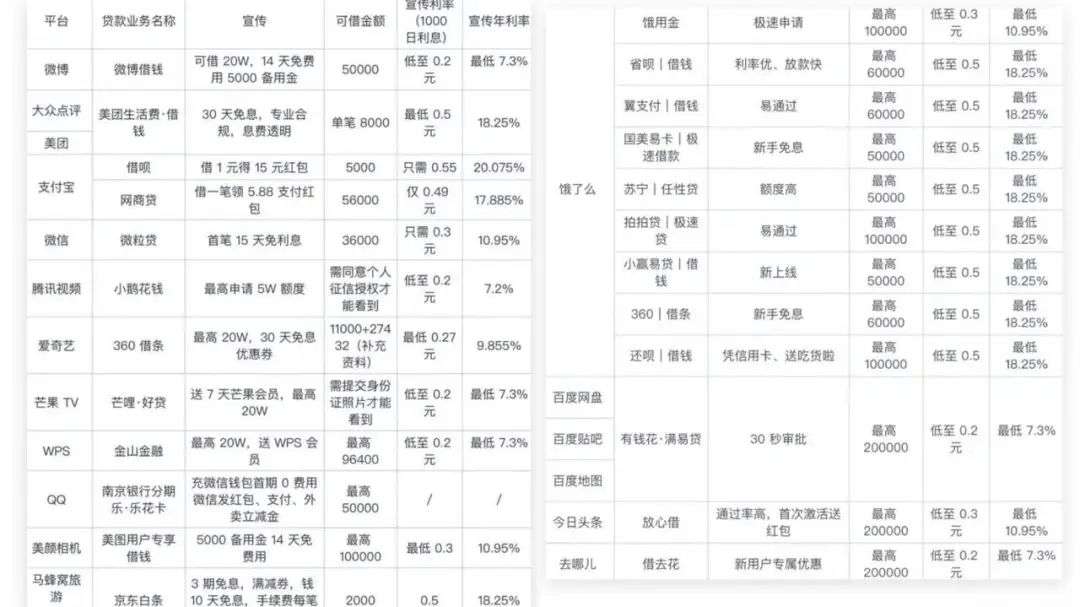 腾讯系的微信、QQ,阿里系的淘宝、饿了么,百度系的百度地图、爱奇艺,还有滴滴、微博、美团等巨头也卷入其中.....提供几千到二十万不等的贷款——前有买菜,后有放贷,在巨头的角逐场上,二者火热程度不相上下。