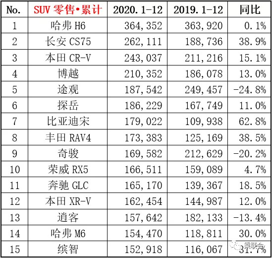 乘联会公布的这份SUV榜单,可以看到雷打不动的销冠位置依然属于哈弗H6。据我所了解,这已经是H6不知道连续多少个月蝉联销冠。不过实际上如今H6的位置也没有那么稳妥,据悉8月前的销量都是在往下跌的。直到金九银十冲量期和适逢换代车型的上市,销量才迅速止跌上升,整年新车零售364,352辆同比2019年出入不大,只有0.1%的增幅,看来在长城30周年大会上魏总发表的「居安思危」一说并不是开玩笑。