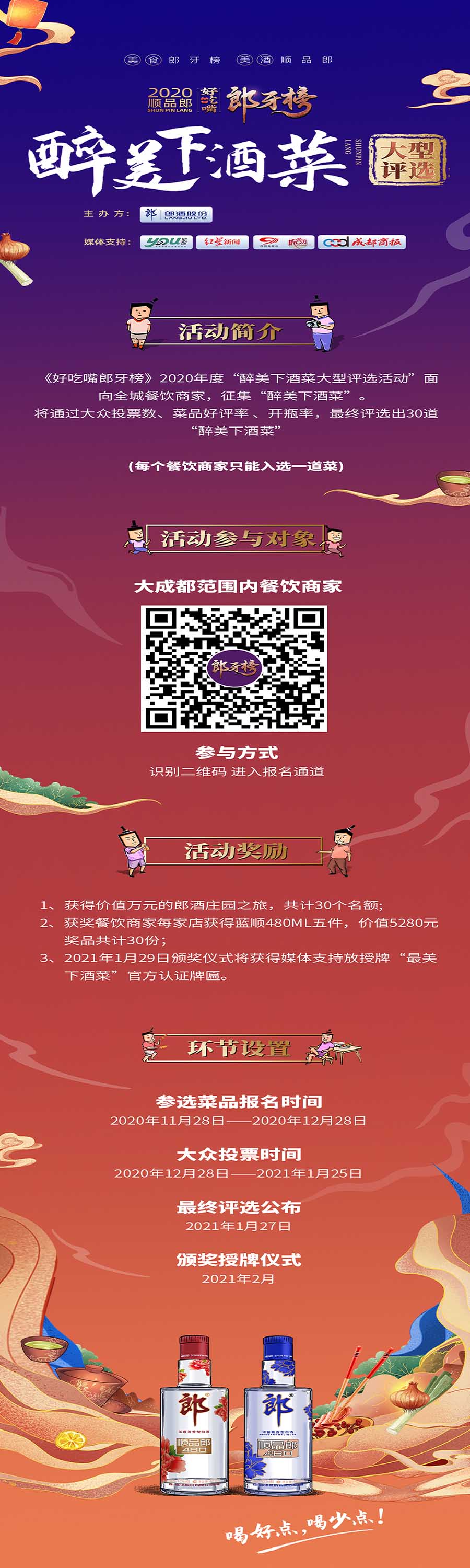 投票方式:好吃嘴儿们可通过微信小程序搜索“小郎酒club”进入醉美下酒菜投票页面,选出与顺品郎最配的那道下酒菜;在点评页面为自己心中的“醉美下酒菜”点赞打call。报名成功的餐饮商家,也可在投票页面生成专属于宣传海报,转发到朋友圈为自己拉票宣传,提升人气,增加曝光量。