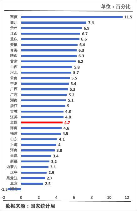 国家统计局数据显示,2020年,河北、山西、吉林等19个省份居民人均可支配收入名义增速超过全国4.7%的水平,整体呈现西快东慢的态势。其中,西藏居民人均可支配收入名义增速高达11.5%,是全国唯一一个实现双位数增长的省份。