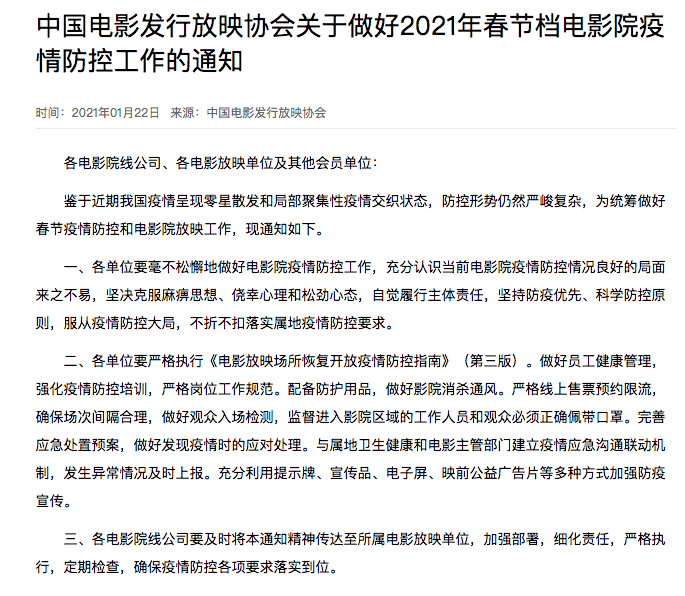 1月22日,中国电影发行放映协会发布关于做好2021年春节档电影院疫情防控工作的通知。通知显示,各单位要严格执行《电影放映场所恢复开放疫情防控指南》(第三版)。做好员工健康管理,强化疫情防控培训,严格岗位工作规范。配备防护用品,做好影院消杀通风。严格线上售票预约限流,确保场次间隔合理,做好观众入场检测,监督进入影院区域的工作人员和观众必须正确佩带口罩。完善应急处置预案,做好发现疫情时的应对处理。与属地卫生健康和电影主管部门建立疫情应急沟通联动机制,发生异常情况及时上报。充分利用提示牌、宣传品、电子屏、映前公益广告片等多种方式加强防疫宣传。