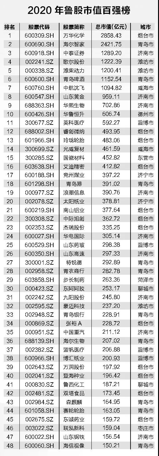 此前,国内知名金融数据和分析工具服务商Wind发布了《万得2020年度中国上市企业市值500强》榜单,万华化学、海尔智家成功进入了榜单百强,包含浪潮信息、青岛港在内的19家鲁企上榜500强,在国内资本市场上成功为鲁企代言。