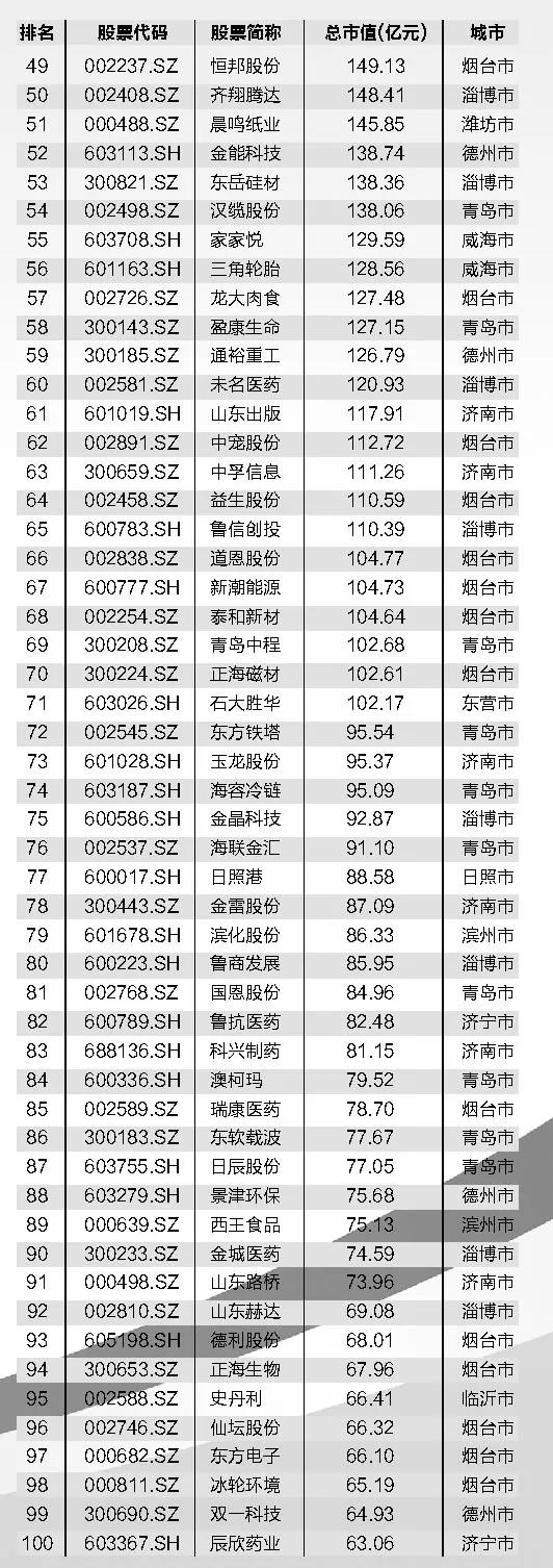 近日,2020年山东上市公司市值百强榜单出炉,数据显示,2020年,山东A股IPO全年过会36家,有17家企业成功登录A股市场,截至去年年底,山东共有A股上市公司227家,总市值达到3.4万亿元,比去年增加1.13万亿元,同比增幅近50%,山东企业展现出强劲的发展动力。