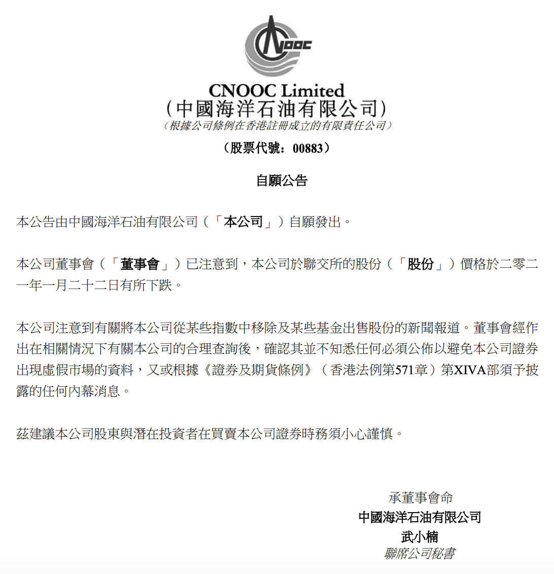 1月22日,中国海洋石油(下称中海油)在港交所发布公告表示,公司注意到有关将公司从某些指数中移除及某些基金出售股份的新闻报道。董事会经合理查询后,确认其并不知悉任何必须公布以避免公司证券出现虚假市场的资料,或根据证券及期货条例须予披露的任何内幕消息。