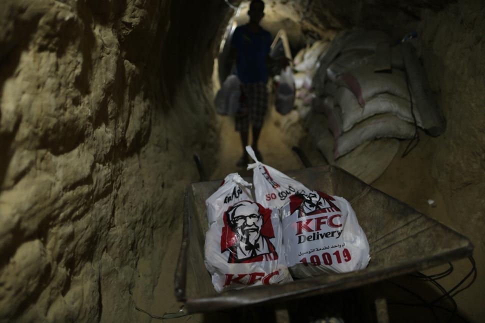 第二天,埃及司机会去肯德基取那几十袋热乎乎香喷喷的炸鸡,带到边境附近的地道入口,接应的埃及伙计拎着穿梭到加沙,通通搬到加沙司机的后座。
