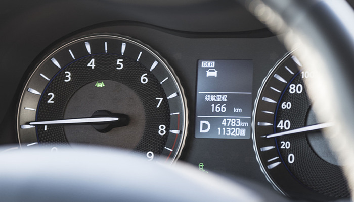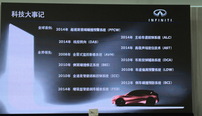 令人印象深刻的是车距控制辅助DCA系统,试驾车辆为英菲尼迪Q70。该系统实时监测与前车之间是否保持足够的安全车距。如果前车减速,使车距低于安全距离,而驾驶者没有及时采取制动措施,甚至还在继续加速,仪表盘上的提示灯便会闪烁提醒,同时发出声音报警,油门踏板也产生反向力,以提示驾驶者危险的存在。与此同时,自动制动系统也开始介入,直至驾驶者接管驾驶或最终将车速减低到零,从而避免由于驾驶者疏忽而造成的追尾碰撞事故。