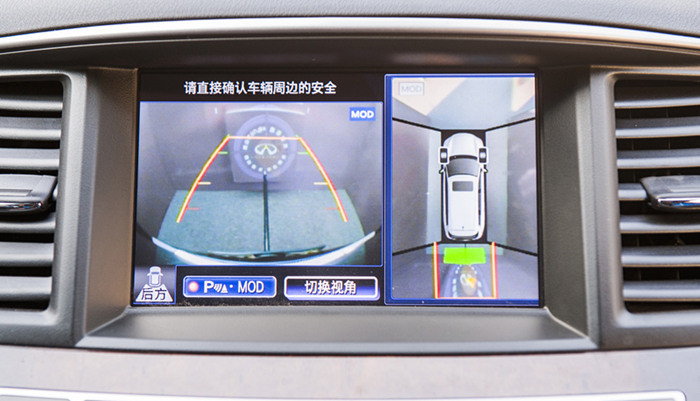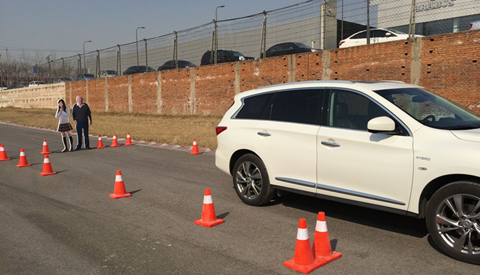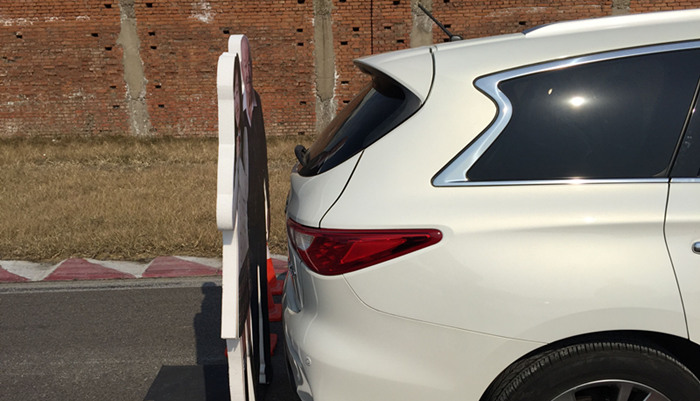 体验车是一辆英菲尼迪QX60,车正后方摆放了两个假人模型障碍物。笔者将车挂入倒挡后,不对车辆进行任何操作,车在缓慢靠近障碍物后并没有即刻停止,而是轻微地碰上了。紧接着的第二次尝试中,一切正常。系统在发出警报后我仍没有踩下制动,于是其在最后一刻自动制动,并保持2秒制动力,这2秒的是用来让司机反应过后踩下制动踏板的时间。