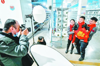 浙江省湖州市一个纺织工家庭拍摄全家福,准备寄回老家。新华社发