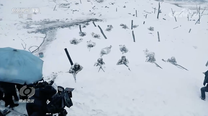 2020年11月,为了真实还原朝鲜战场的一个场景,剧组演职人员在零下23℃的气温中拍摄近22个小时。1950年11月下旬,为了取得长津湖战役的胜利,志愿军战士提前在阵地上设伏包围美军,坚守六天六夜,其中100多名战士因为零下40℃的极寒天气壮烈牺牲。