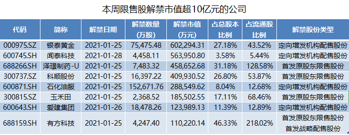 本周限售股解禁数量超过1亿股的上市公司合计有5家,分别为石化油服(600871.SH)、银泰黄金、爱建集团(600643.SH)、科顺股份(300737.SZ)、张家港行(002839.SZ)。