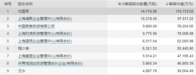 这批解禁股东共16位,均是知名机构和投资者,包括汇安基金、中信建投、国泰君安、财通基金、博时基金、招商基金、高毅资产等,还有知名外资JPMorgan Chase Bank(摩根大通银行)、UBS AG(瑞士银行),还有资本大鳄葛卫东等。