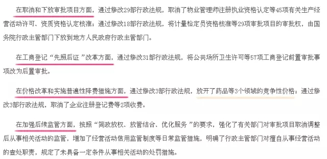 《决定》指出,为了依法推进简政放权、放管结合、优化服务改革,国务院对取消和调整行政审批项目、价格改革和实施普遍性降费措施涉及的行政法规进行了清理,决定对66部行政法规的部分条款予以修改,修改的内容主要包括: