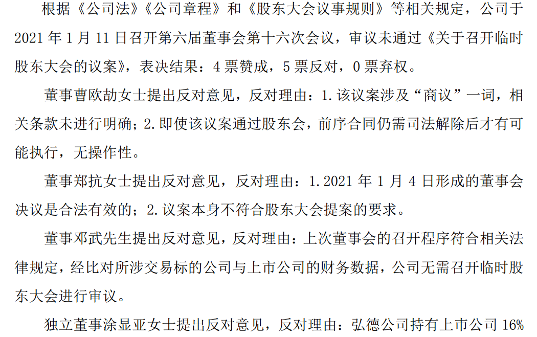 1月11日,神农科技公告称, 湖南弘德提议的临时股东大会并未获得通过,董事会层面获得4票赞成5票反对。反对的董事方大致认为,提议不明确,无操作性。