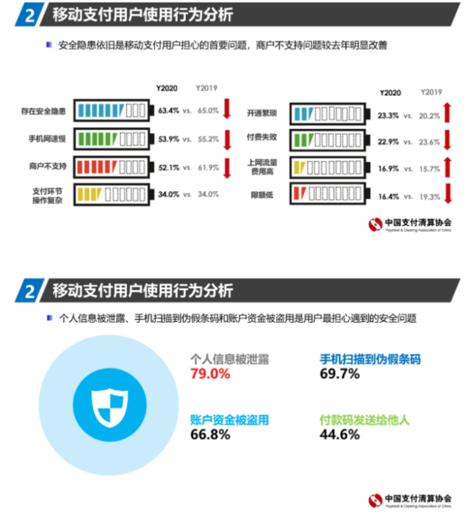 根据支付清算协会1月13日发布《2020年移动支付用户问卷调查报告》中显示,安全隐患依旧是移动支付用户担心的首要问题,79%用户最担心的是个人信息被泄露,69.7%的用户担心手机扫描到假的条码,66.8%的用户担心账户资金被盗用,44.6%的用户担心付款码被发送给他人。