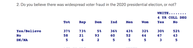 昆尼皮亚克大学(Quinnipiac University)1月11日发布的全美民意调查显示,示威者暴力冲击国会大厦之后,仍然有73%的共和党人认为2020年大选中存在“大规模舞弊”,93%的民主党人认为根本没这回事。此外,81%的共和党人认为参议院不应该对特朗普定罪,87%的民主党人则认为他应该被定罪。撕裂程度可见一斑。
