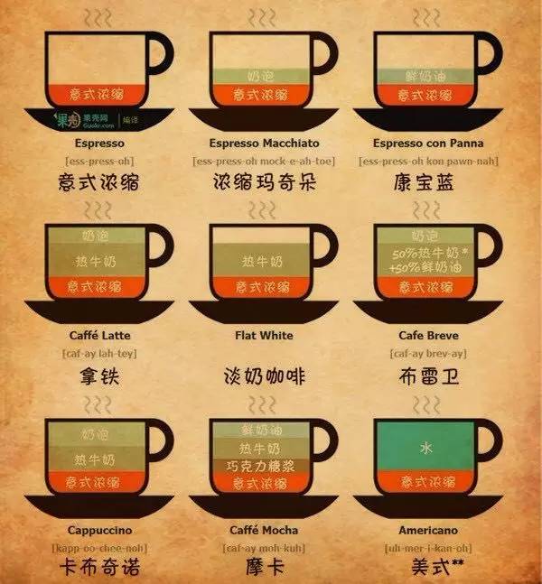 顺带附上一张广为流传的咖啡科普图,供小伙伴们涨姿势: