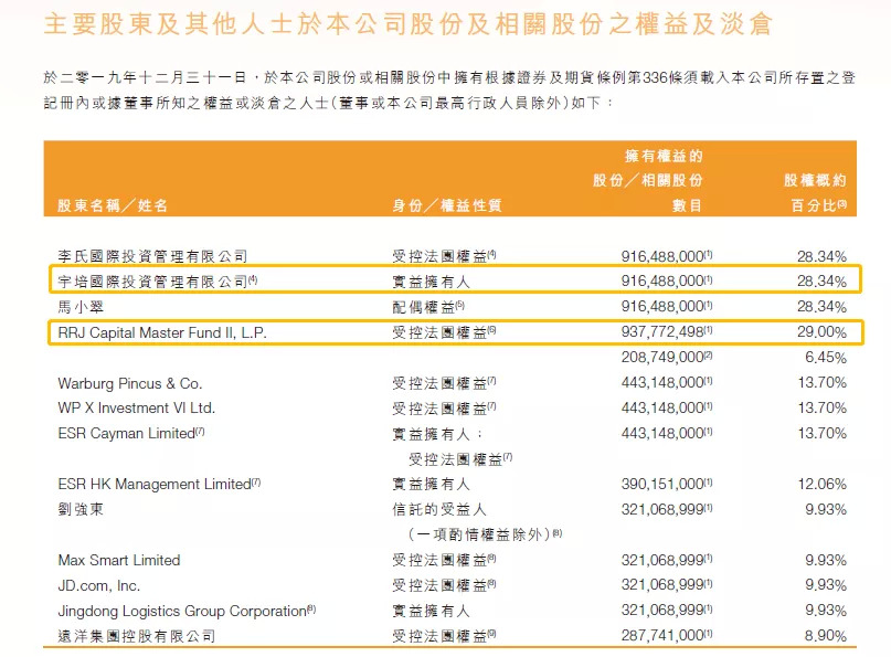 要知道,宇培国际和RRJ Capital正是中国物流资产两个最大的持股股东。中国物流资产是由宇培国际、RRJ Capital、京东共同在中国投资的物流基础设施开发平台。2019年报显示,RRJ Capital 持股占比29%;宇培国际持股占比28.34%,宇培国际也是中国物流资产董事长李士发控制的公司。