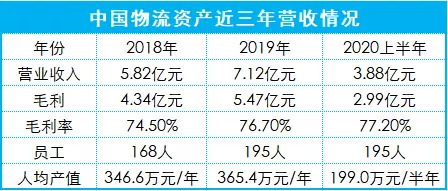 选址960统计了中国物流资产近三年(2018年、2019年及2020上半年)的营收,发现其宝藏特质:毛利率高于70%,资产负债率低于50%,年人均创造产值超过300万元。其2019年营业收入7.12亿元,员工人数195人,年人均营收达365万元,已属业内翘楚。号称人均产值最高的公司腾讯,2019年人均营收接近600万元。显然,中国物流资产的人均营收非常出色,丝毫不逊色于某些高科技龙头及互联网大厂。
