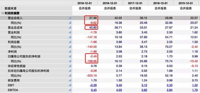 根据万得股票披露数据,2019年东易日盛实现营收37.99亿元,同比负增长9.62%,然营业成本高达40.8亿元,加上突然计提的2.4亿资产减值损失和商誉减值,导致公司全年营业利润亏损1.79亿元,同比大幅下滑147.18%。由此也导致公司全年归母净利润亏损2.49亿元,同比下降198.66%。
