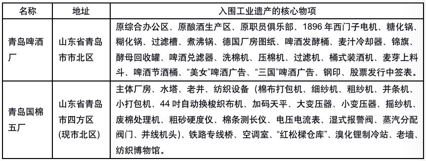 国家工业遗产是指在中国工业长期发展进程中形成的,具有较高价值并经工业和信息化部认定的工业遗存,有较高的经济、社会和历史价值。截至目前,山东省共入围8个项目,其中青岛有2个项目:位于市北区的青岛啤酒厂(青岛啤酒博物馆)和青岛国棉五厂(纺织谷)。