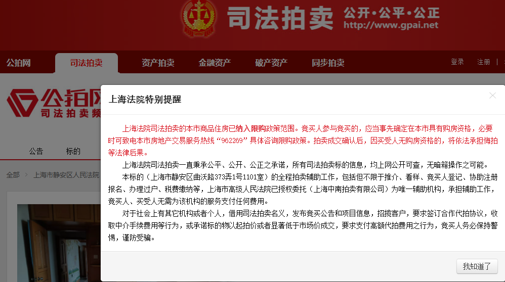 1月25日,记者从公拍网获悉,上海法院司法拍卖的上海市商品住房已纳入限购政策范围。竞买人参与竞买的,应当事先确定在上海市具有购房资格。拍卖成交确认后,因买受人无购房资格的,将依法承担悔拍等法律后果。