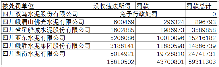 其中,四川双马水泥股份有限公司被免予行政处罚,其余五家企业分别没收违法所得,并处于2016年销售额的1%-2%不等作为罚款。