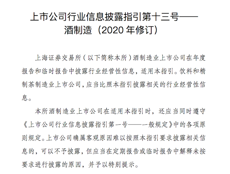 为此,今年1月中旬,上交所发布关于《上海证券交易所上市公司自律监管规则适用指引第5号——行业信息披露》的通知,并在“上市公司行业信息披露指引第十三号——酒制造(2020年修订)”中指出,上市公司召开经销商会等会议,或者通过非法定渠道对外发布对公司股票及其衍生品种交易价格可能产生较大影响的重大信息的,应当先行履行信息披露义务。公司不得以新闻发布或者答记者问等其他形式代替法定信息披露或泄露未公开重大信息。