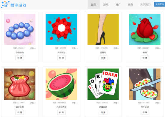 以《合成大西瓜》来说,这款游戏的走红有着很强的随机性,在玩法上虽然看似不错,但是这种操作简单以及有趣的模式其实并不少见。在《合成大西瓜》的背后是一家名为微伞游戏的公司,虽然叫做微伞游戏,但是他们并不是以游戏研发作为主要营收,而是H5小游戏定制为主,主要是通过小游戏的品牌传播以及活动为主,所以《合成大西瓜》只是他们其中一款产品。