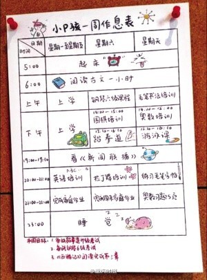 近日,朋友圈里一张“小P孩作息时间表”的图引发了网友热议,按照这张作息时间表,“小P孩”每天5点起床,一直要学习到23点才能睡觉。每天学习18小时、睡眠6小时。“小P孩”的家长刘女士是北大毕业,她表示自己也是这么过来的。