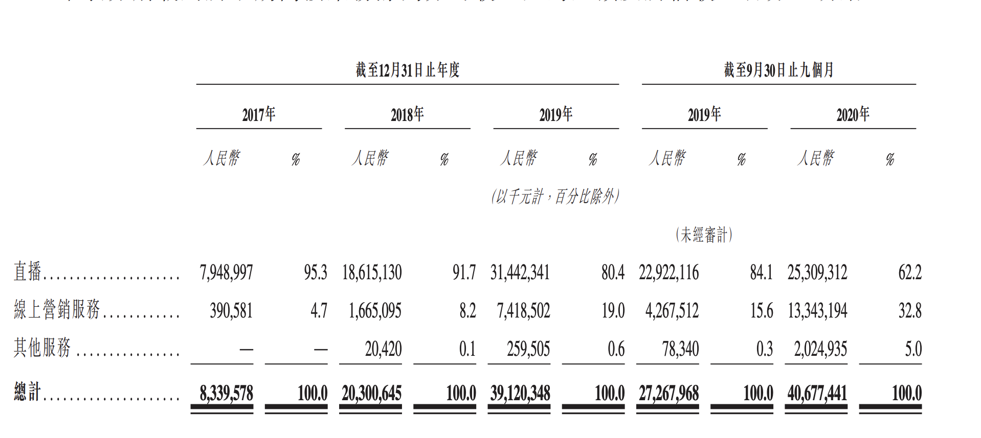 总体来看,快手营收呈现快速增长状态。招股书显示,2017年,快手营收人民币83亿元,2018年为203亿元,2019年为391亿,2020年上半年253亿元,2020年9月407亿,2020年11月未经审计营收525亿元。