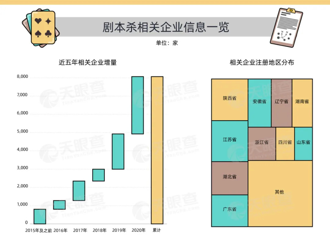 天眼查数据显示,剧本杀相关企业注册数量从2015年的不足1000家,逐年增长,截至2019年增至近5000家。在2020年,剧本杀企业实现了井喷式的增长,目前累计企业数量已经超过了8000家。