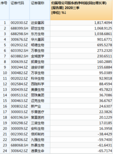 延续了此前口罩、消杀、防护等非常态背景下的一些行业的上扬态势,数据显示,在A股24只新冠核酸检测概念股中,20家企业去年前三季度实现了净利润的同比增长,达安基因、硕世生物、东方生物净利润同比增幅超1000%。