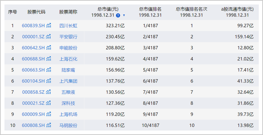▲1998年12月31日A股总市值前10;图源:同花顺iFinD