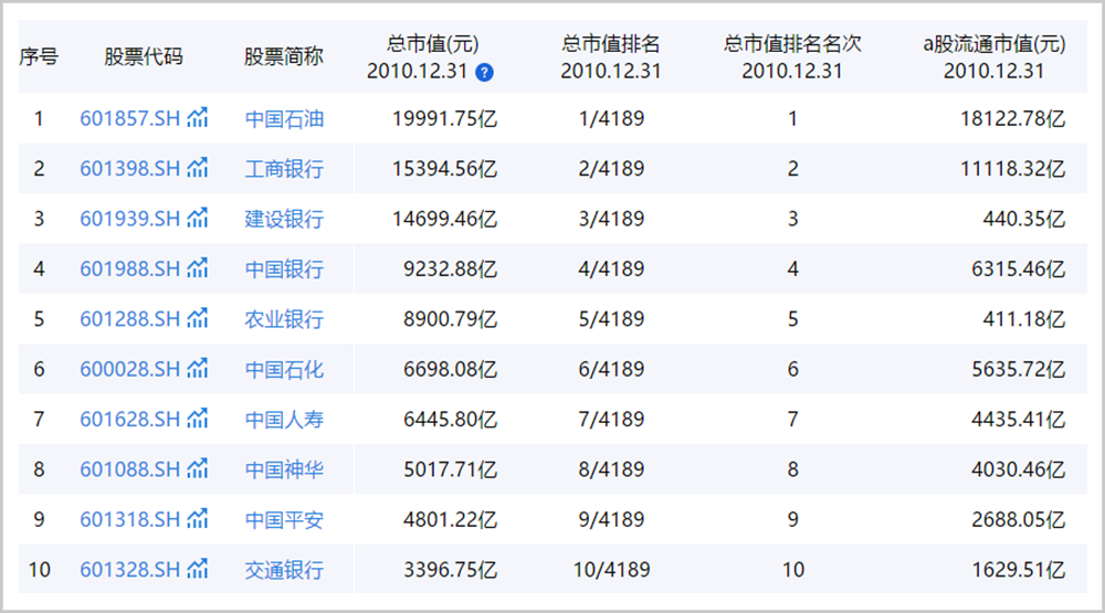 ▲2010年12月31日A股总市值前10;图源:同花顺iFinD
