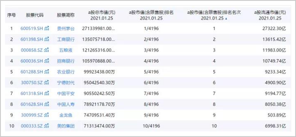 ▲2021年1月25日A股总市值前10;图源:同花顺iFinD