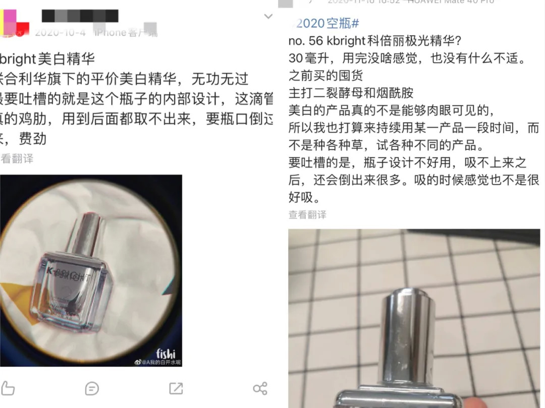 比如明星产品“极光瓶”,消费者在社交平台小红书、微博po出使用体验: