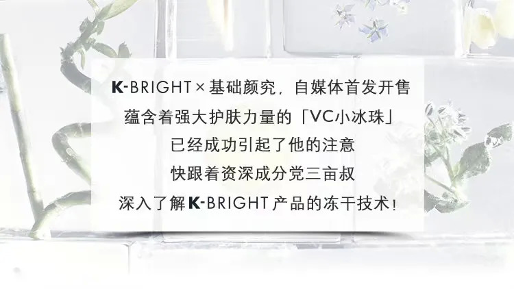 正如上文所说,2019年底,K-BRIGHT联手由三亩大叔创办的成分党自媒体“基础颜究”在微店平台首发产品,而“基础颜究”以鉴别有效产品和有效成分著称,实际上相当于给K-BRIGHT作出了强有力的功效背书。