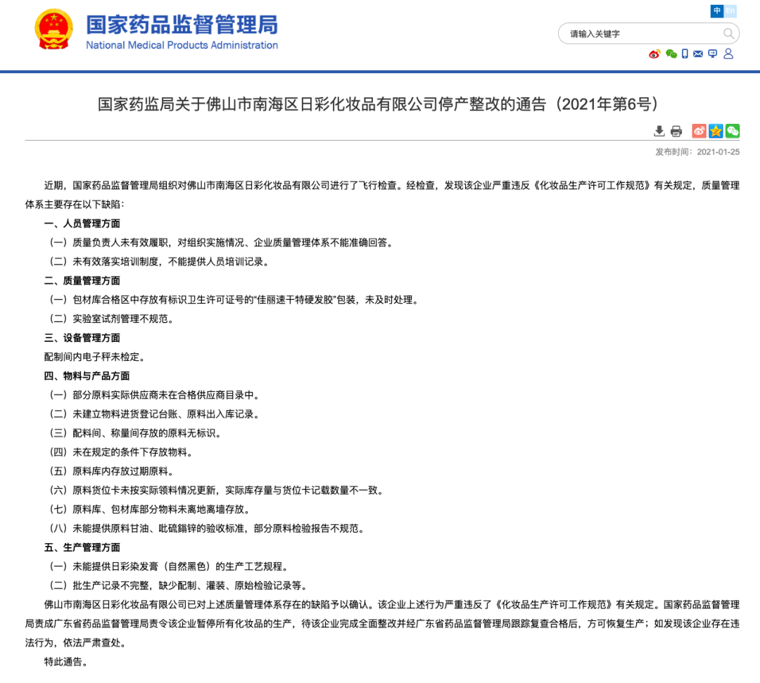 1月25日,国家药品监督管理局发布《国家药监局关于佛山市南海区日彩化妆品有限公司停产整改的通告(2021年第6号)》。