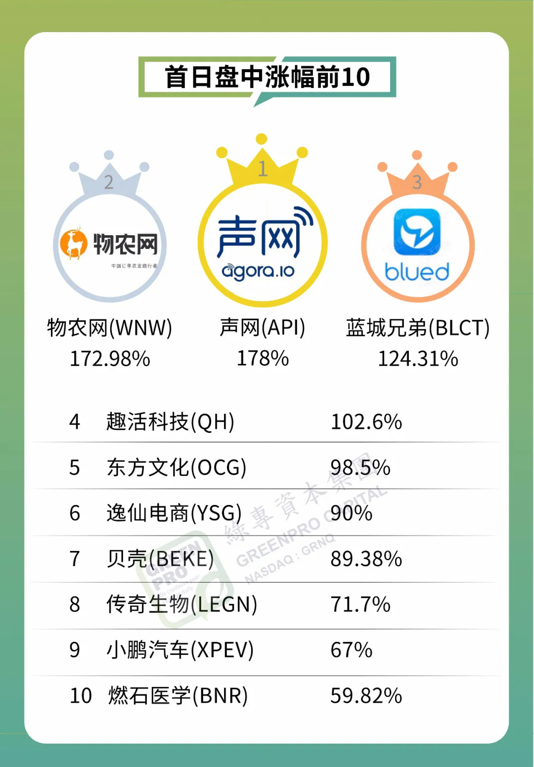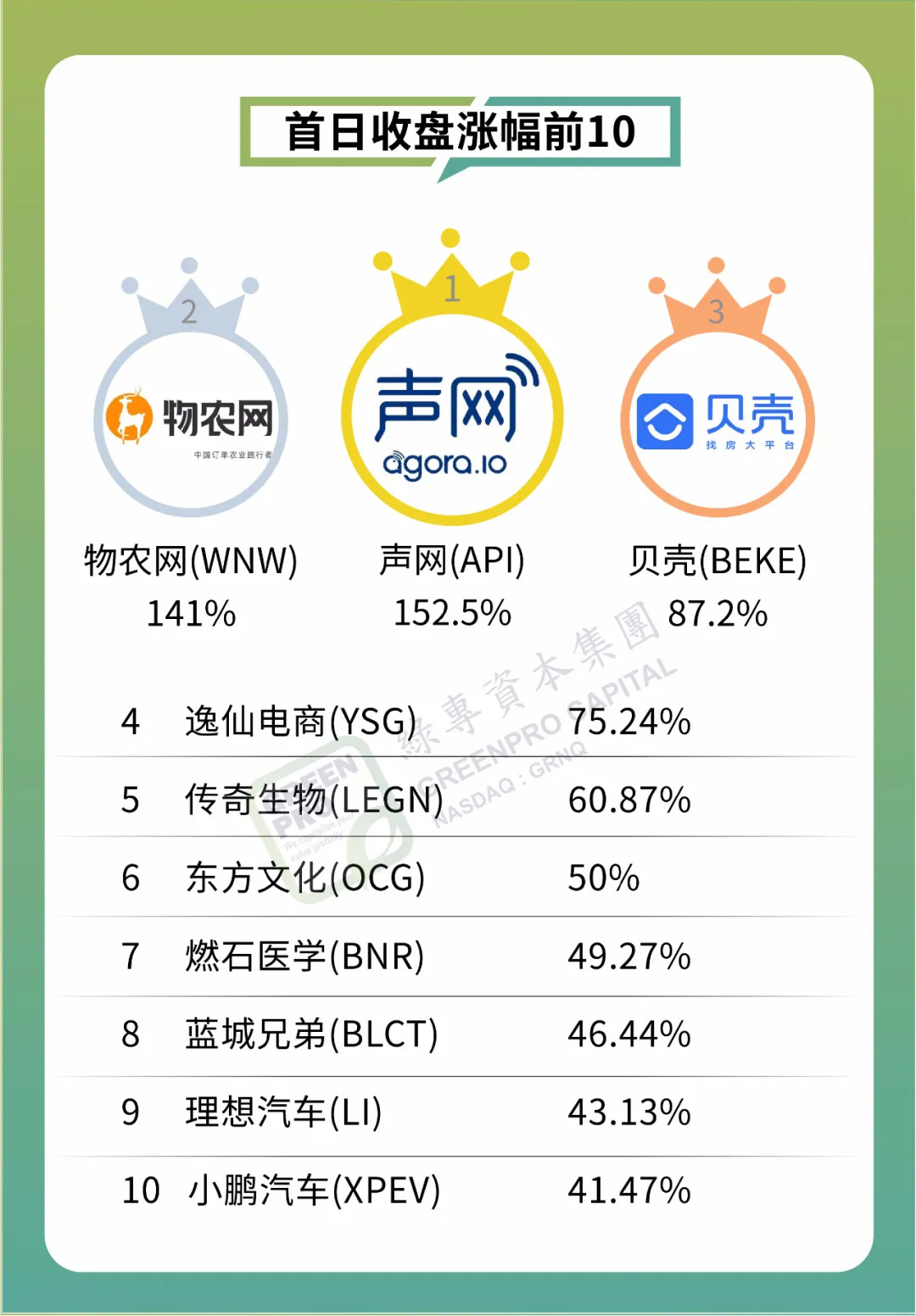 首日收盘涨幅中,排名略有变化,声网(API)、物农网(WNW)2家公司依然排在首位和第二位,但第三、第四换成了贝壳(BEKE)、逸仙电商(YSG),涨幅分别为:152.5%、141%、87.2%、75.24%。