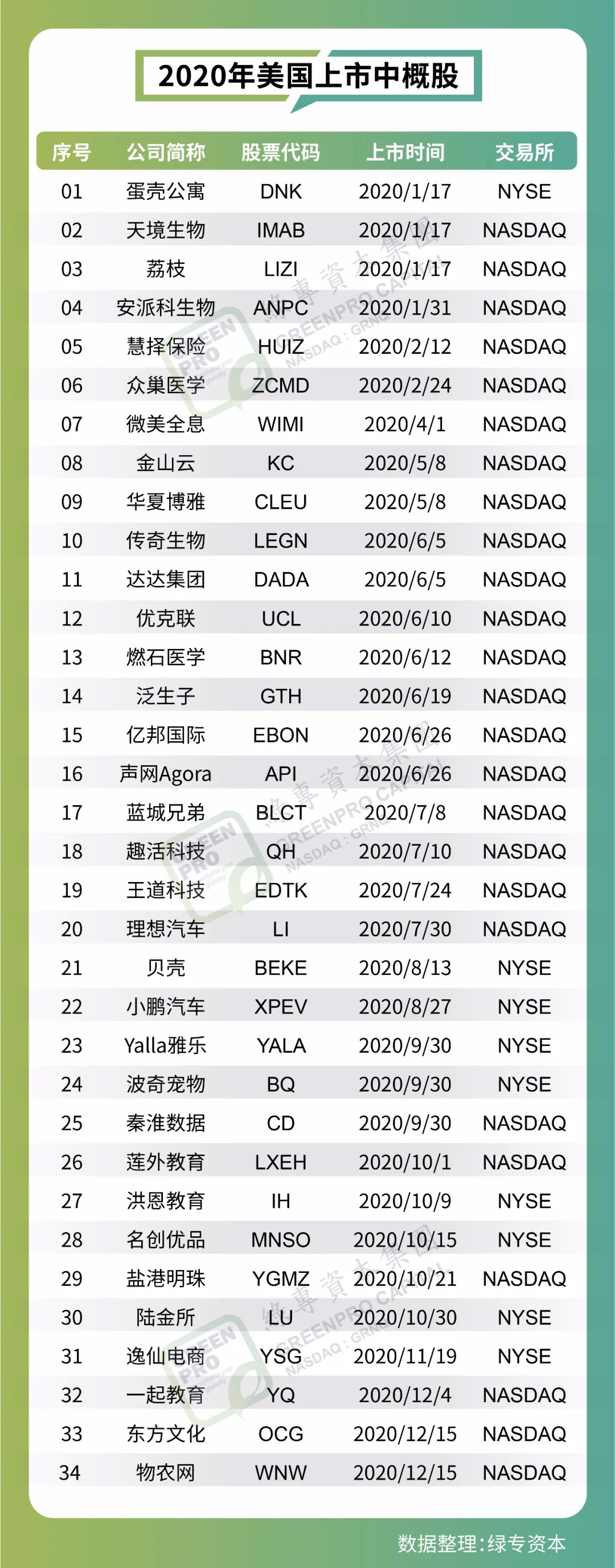 绿专资本统计显示,2020全年,有34家中国企业赴美上市(注:仅指通过IPO),共募集资金约为124亿美元。与2019年相比,IPO数量和募资额分别增长了6.25%和254%。