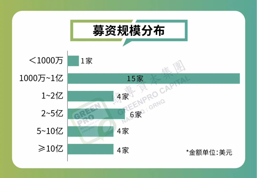 从募资额分布来看,1000万美元以下,有1家;1000万-1亿美元之间,15家;1-2亿美元之间,4家;2-5亿美元之间,6家;5-10亿美元之间,4家;10亿美元及以上:4家。