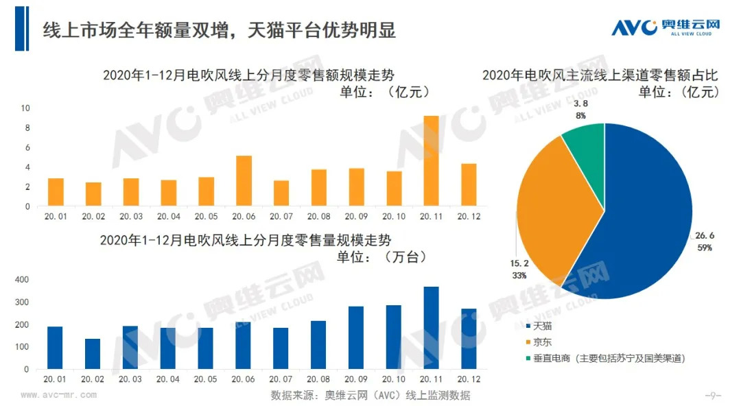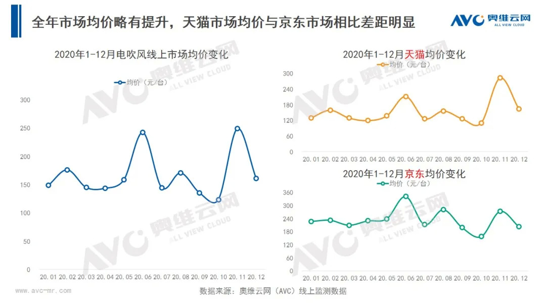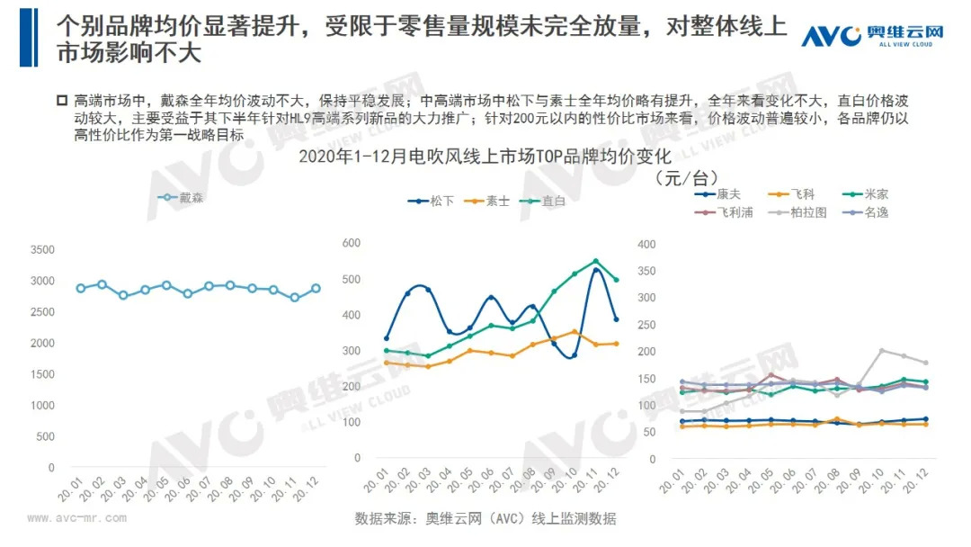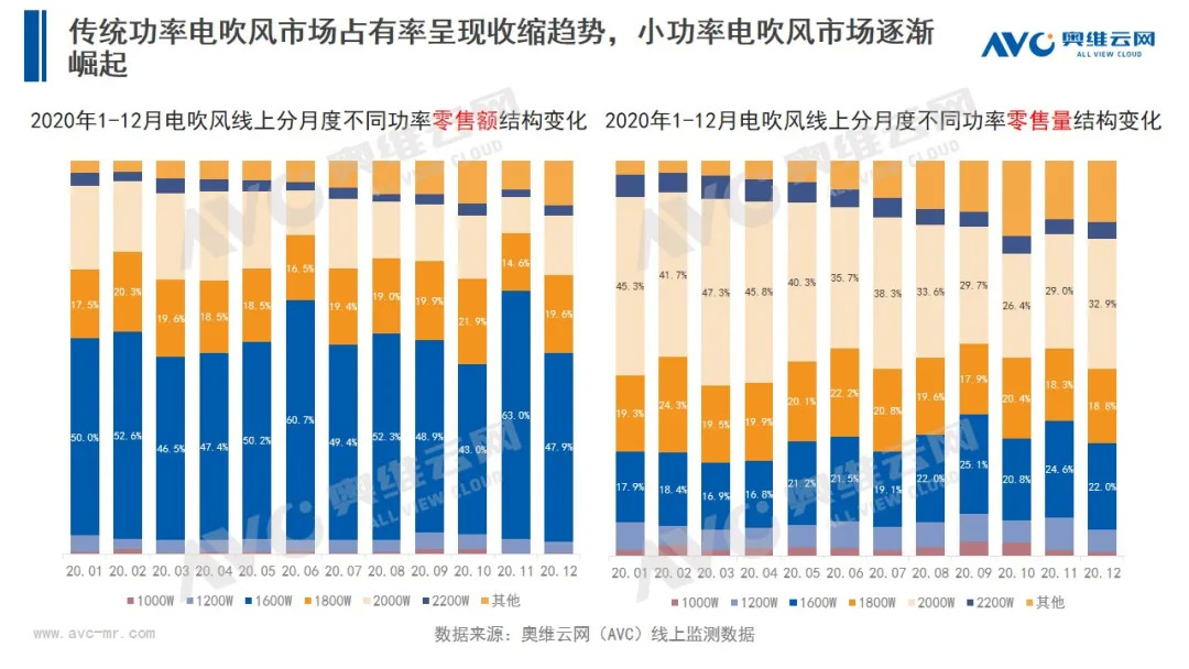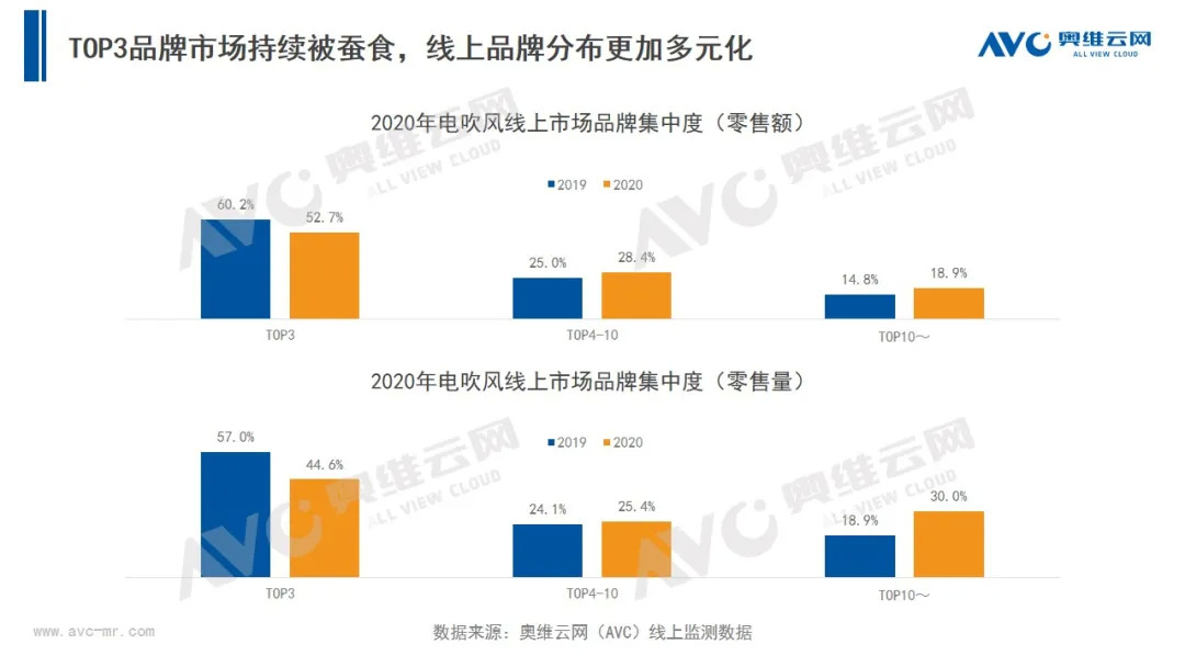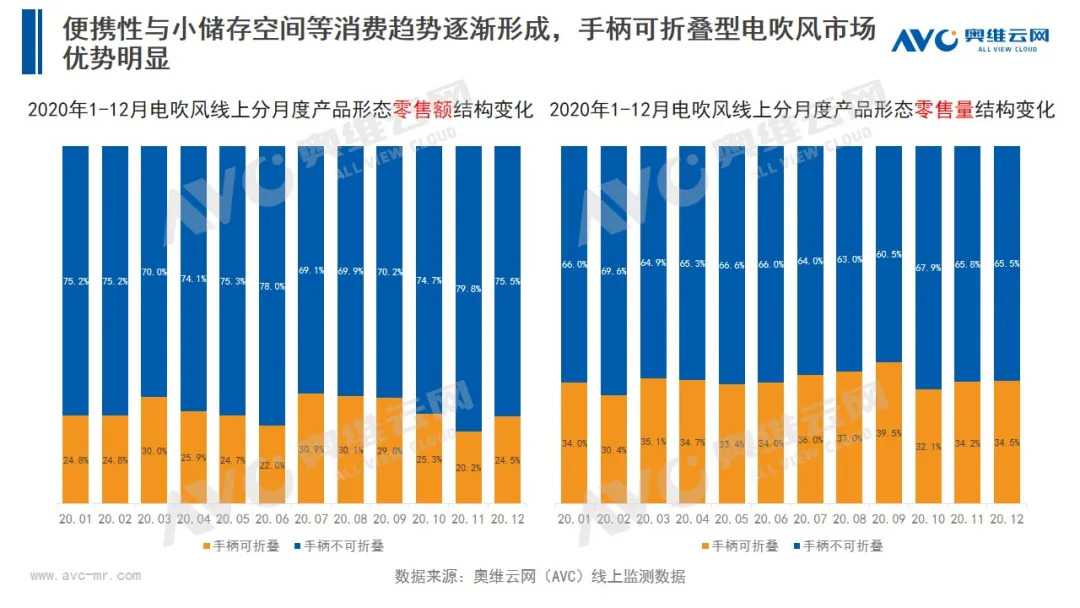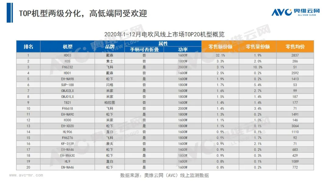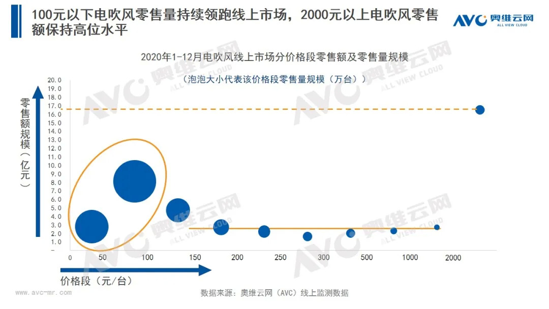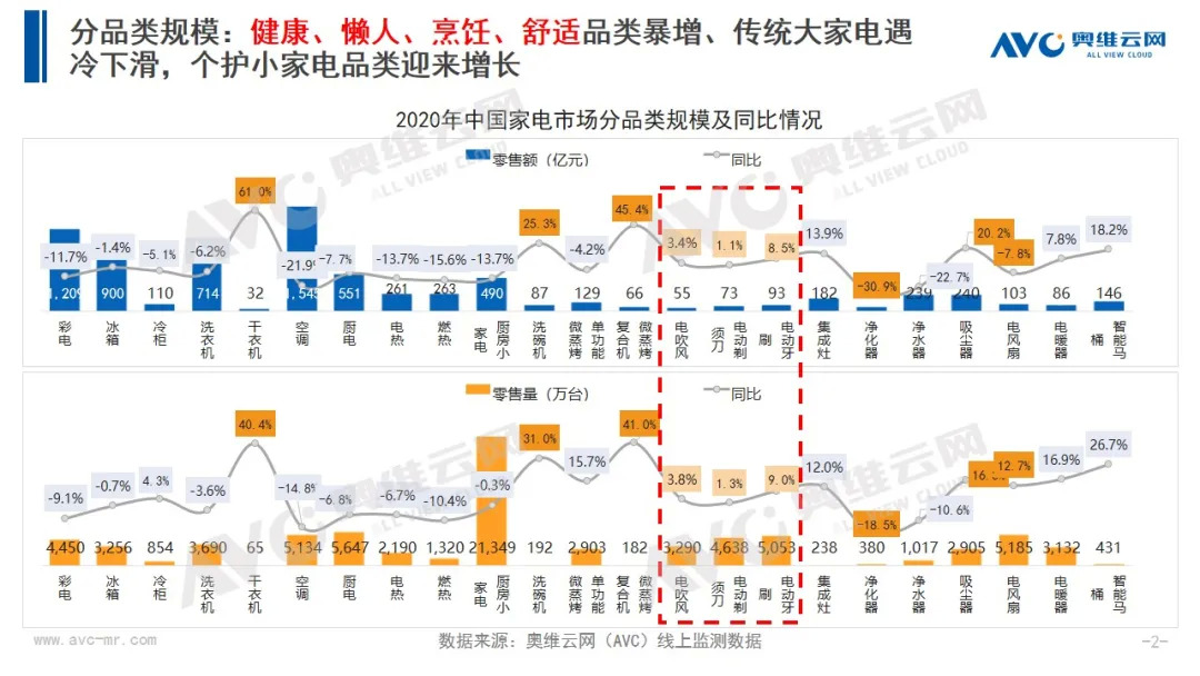 2020年在疫情大环境影响下,线上电吹风市场开年受挫,根据奥维云网(AVC)线上监测数据来看,2020年1-5月线上电吹风市场零售额规模同比下降近20%。在“宅经济”的快速发展与疫情常态化的背景下,下半年线上电吹风市场有所回升,全年同比增长3.4%,否极泰来,以崭新的姿态迎接2021年的挑战。