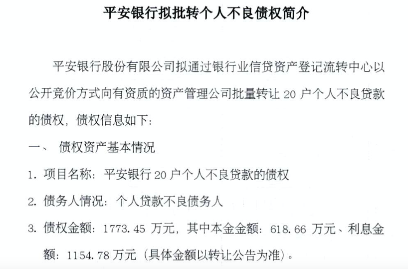 个贷不良转让正式启动!1月25日,银登网发布平安银行拟批量转让个人不良债权的信息。