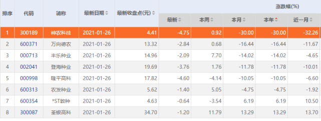 1月26日收盘,神农科技报收于4.41元,跌幅为4.75%。而自2021年以来,公司股票累计跌幅达30%,在所属种子生产行业,跌幅位列第一。